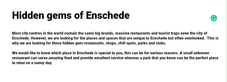 Our aim with this installation is to allow people that are visiting the city of Enschede to truly experience the spaces and places that make Enschede unique. We know about some of these special locations ourselves however, we believed it would be beneficial to ask our target audience (adventurous people from age 18 to 40) about places that they find interesting. Each person upholds different values and interests, this means that they might think up completely different spaces and places that we did. This helps us to identify any special spots we missed and works to add variety to our offer. Because of this launching, a questionnaire amongst our target audience would be a perfect way to get an idea of what locations our target audience would like to be included in the installation. In order to collect genuine and complete answers, I only asked 3 questions.